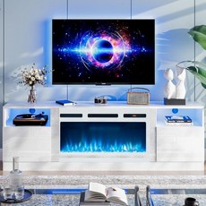 36인치 전기 벽난로가 있는 원인밀 벽난로 TV 스탠드 LED 조명 엔터테인먼트 센터 최대 80인치 70인치 블랙의 하이라이트 수납장이 모던 우드 텍스처 스탠드, 70'', White & White